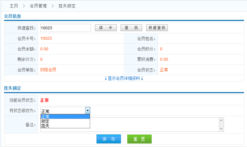 注意:修改會(huì)員的不同狀態(tài)信息,控制會(huì)員卡的使用范圍 掛失/鎖定的卡,在系統(tǒng)中將不可操作,要想重新啟用該會(huì)員卡,必須將會(huì)員卡的狀態(tài)信息改為正常!