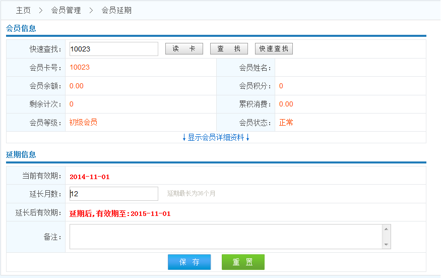 操作流程: 查找會(huì)員------>錄入延期的月份------>保存------>延期成功