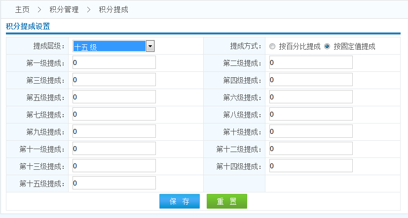 固定積分提成:為每一個(gè)級(jí)別設(shè)置一個(gè)固定的提成積分(也就是說(shuō) 會(huì)員每消費(fèi)一筆 就按照您預(yù)先設(shè)定的積分?jǐn)?shù)量給推薦會(huì)員增加積分 這個(gè)值必須大于等于1且小于等于10000)