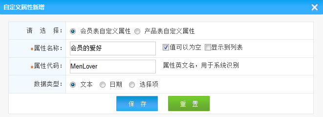 1.屬性類型:選擇自定義屬性類型 是會(huì)員屬性還是產(chǎn)品屬性
