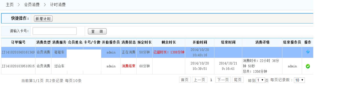 顯示:點擊菜單欄的計時消費,將進入如下界面, 此頁面顯示的是計時消費的詳細(xì)列表