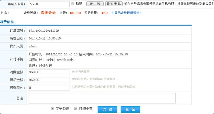 如果會員有充時但是消費時長已經(jīng)超過充時時長,將會跳轉(zhuǎn)到結(jié)算界面(快速消費界面)做結(jié)算;
