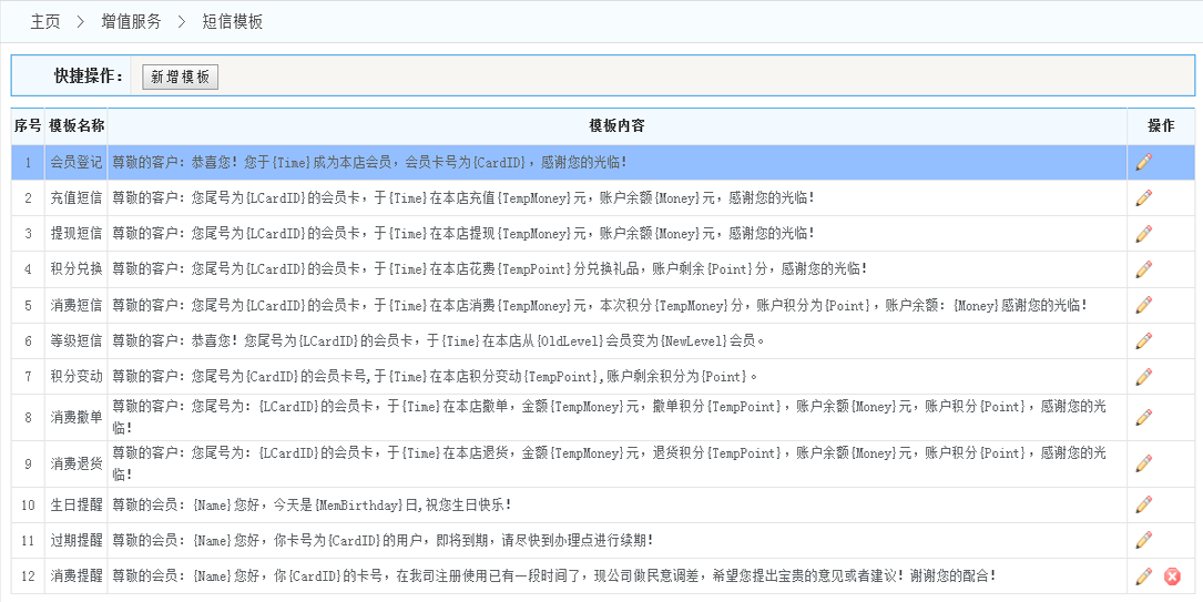 系統(tǒng)模版: 一到十一為系統(tǒng)內置模板只可以修改不可以刪除(包含積分變動、等級短信、消費短信、積分兌換、提現短信、充值短信、會員登記;)十二以后為用戶自定義短信模板,可編寫,可刪除